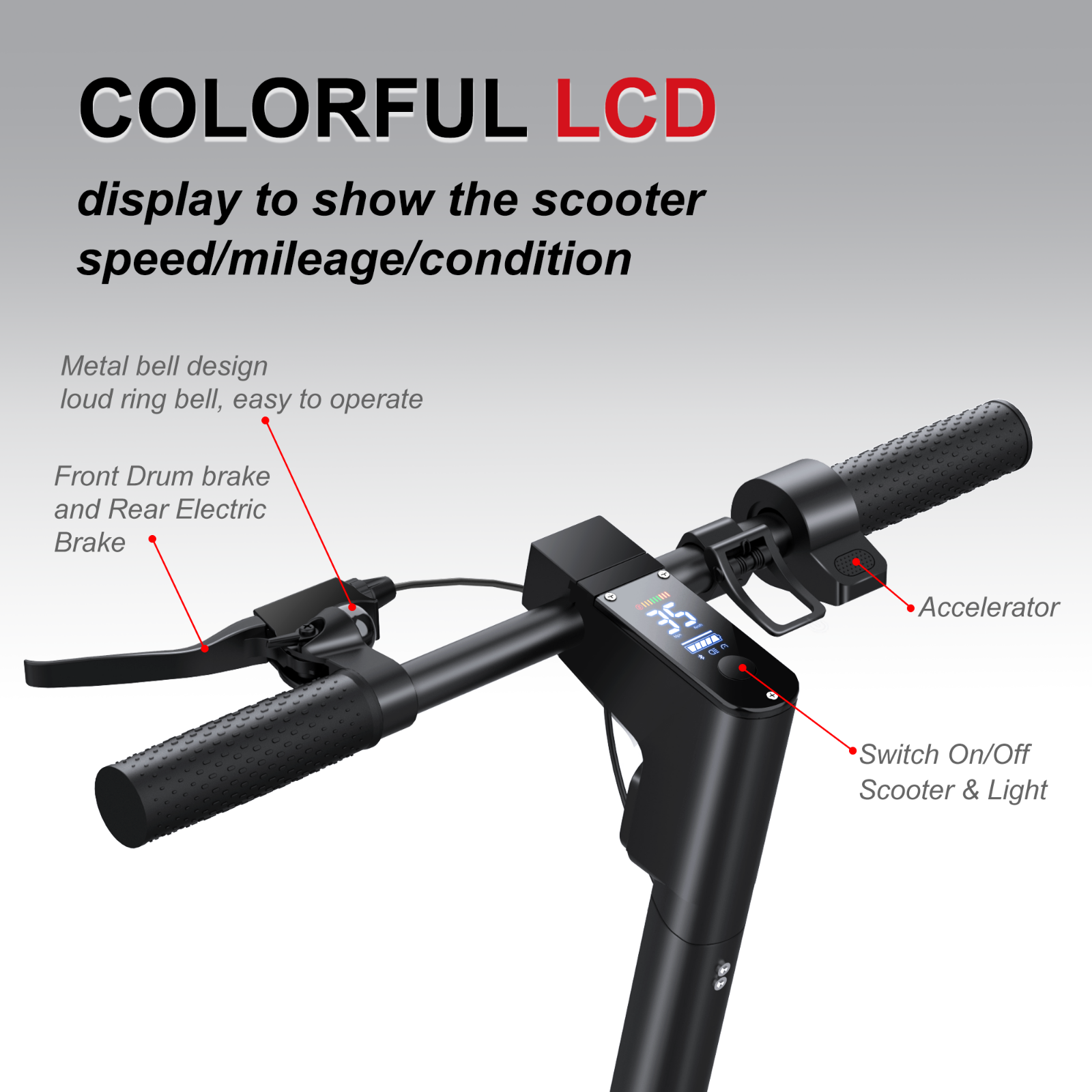 app, speed/battery/mileage display, APP lock for scooter, light switch, scooter switch off, cruise on/off, scooter speed zero & non-zero start, automatic shut down time setting Colorful LCD display to show the scooter speed/mileage/condition Color available in black and white one button,switch on/off, speed adjust,light switch on/off cruise function, make driving smart and relax Double suspension, no inflation, comfortable and safe.