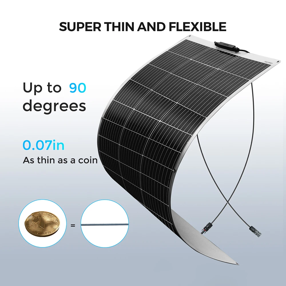 · [Flexible] This flexible solar panel is a good choice for curved surfaces of RV, boat,sailboat, yacht,truck, car, coach, cabin, camper , tent , trailer, golf cart or any other irregular surface.