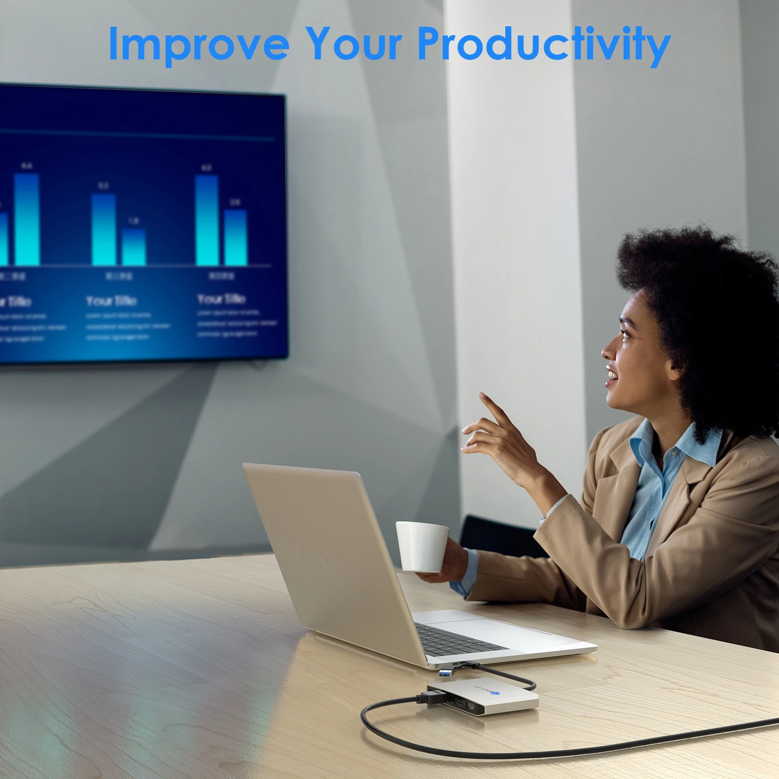 The USB3.0 video adapter adds support for two HDMI/DisplayPort monitors, capable of both extending or mirroring display with resolutions up to dual 5120×1440@60Hz.